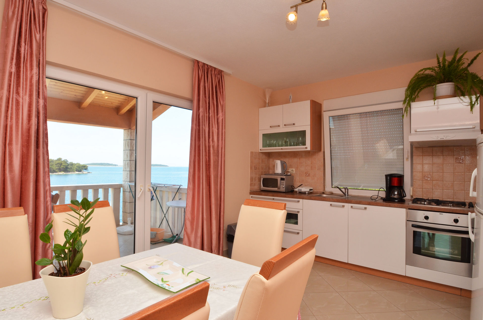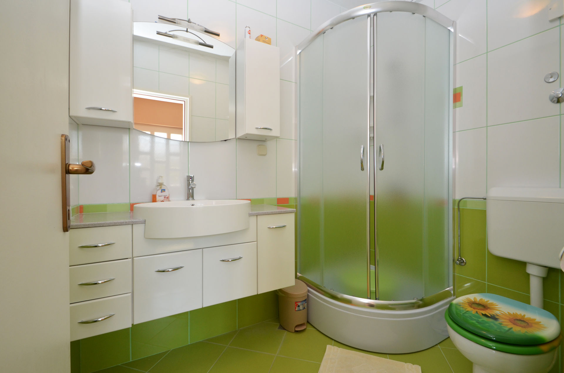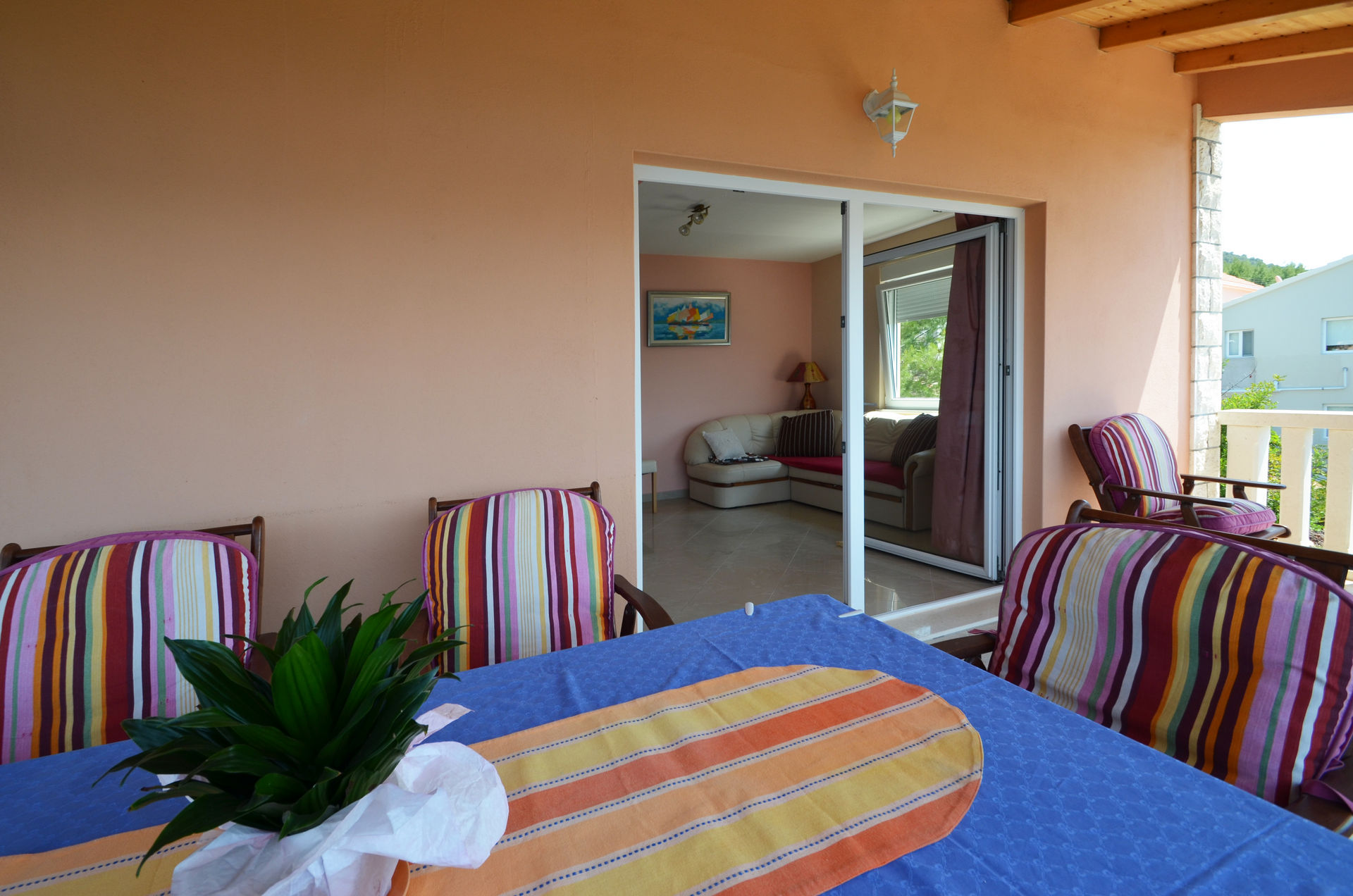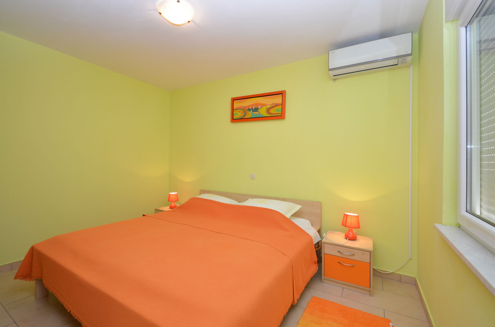 Komforni dvosobni apartman za 4+2 osobu. Apartman 2 s velikom terasom s pogledom na more. Prostrani dnevni boravak. Dvije kupaonice. Klima, sat tv, internet.