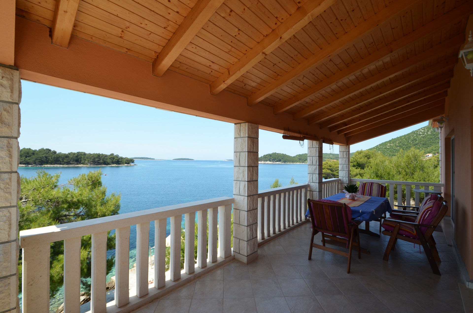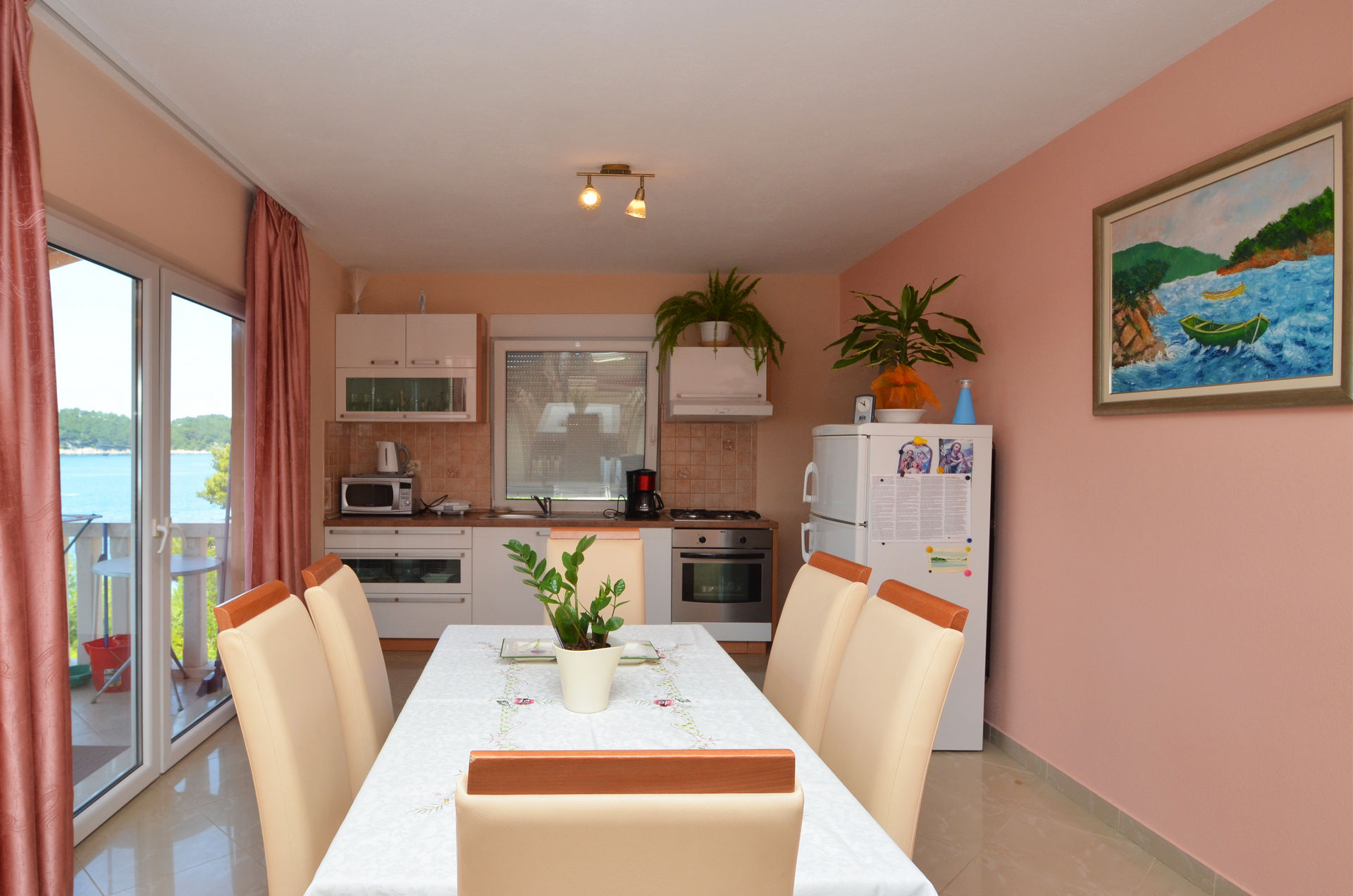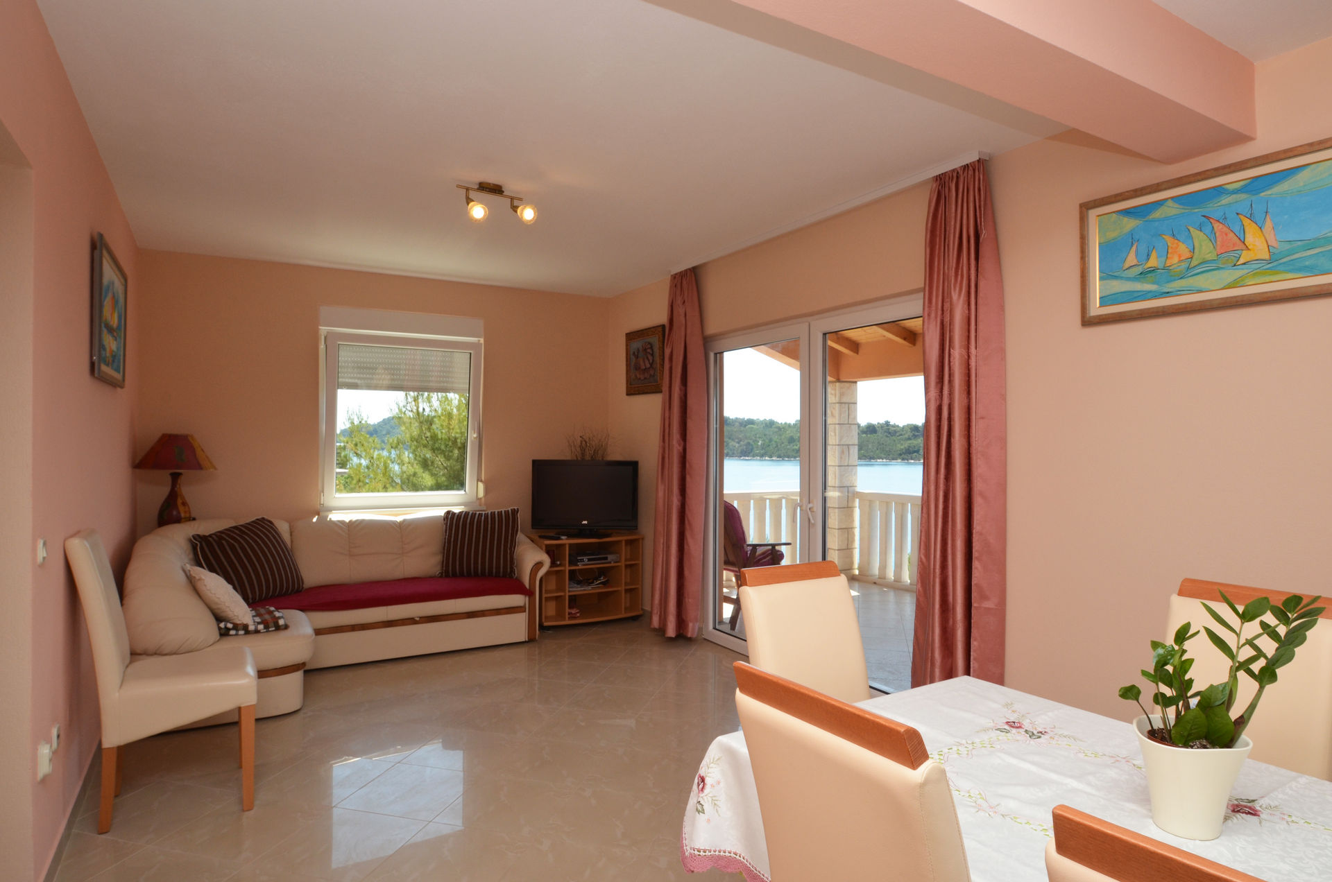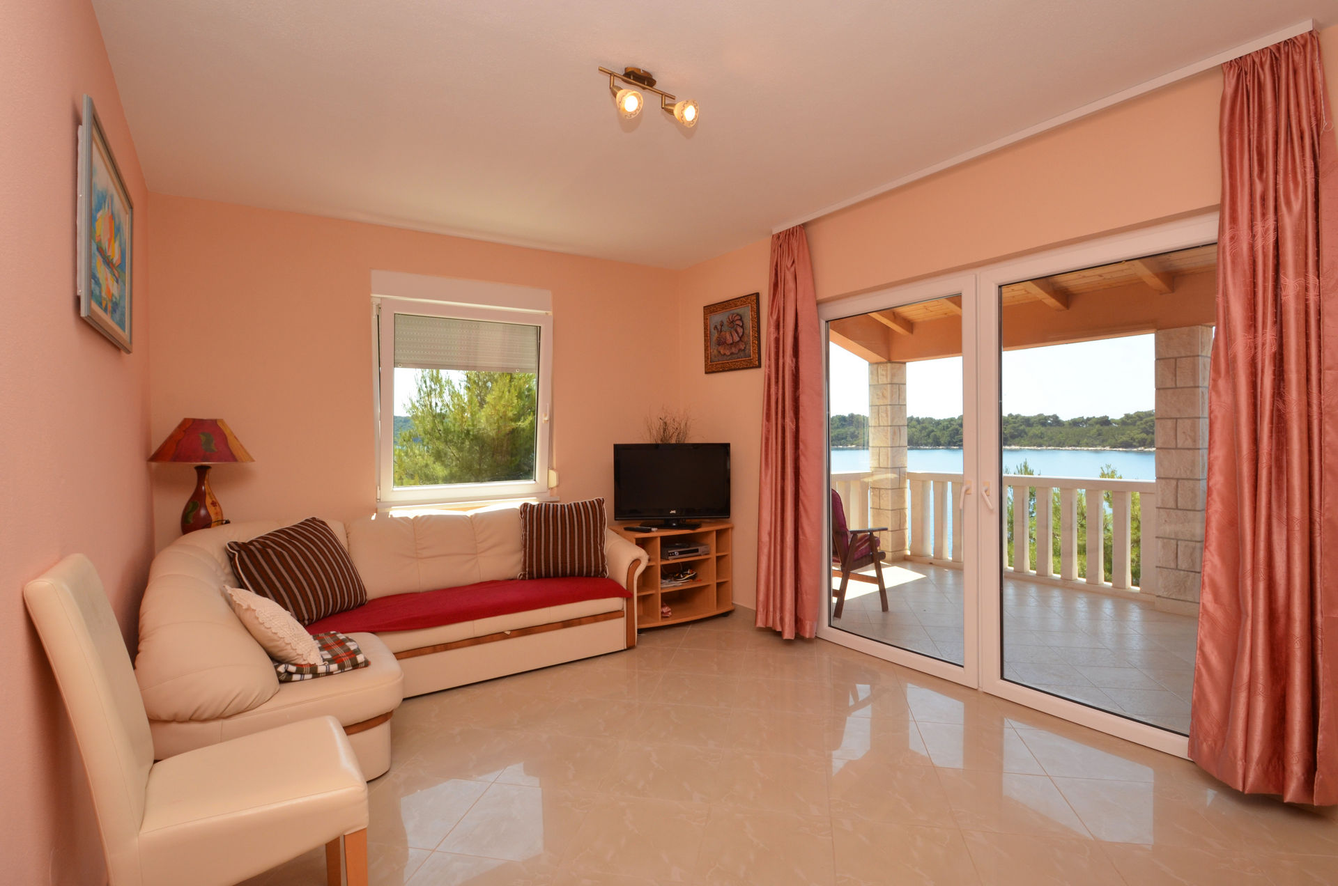 Komforni dvosobni apartman za 4+2 osobu. Apartman 2 s velikom terasom s pogledom na more. Prostrani dnevni boravak. Dvije kupaonice. Klima, sat tv, internet.